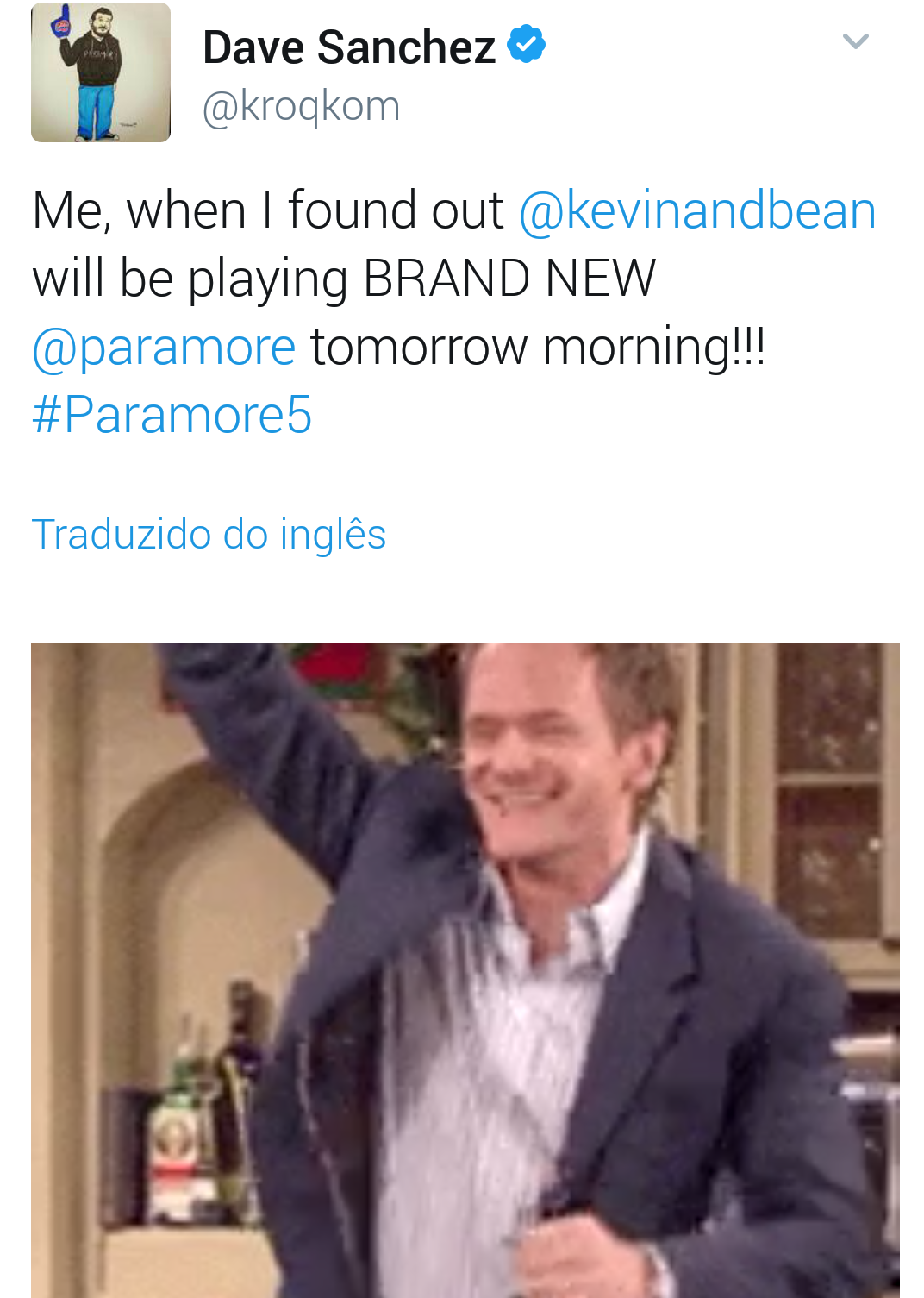 Eu, quando descobri que o Kevin and Bean vai tocar uma MÚSICA NOVA do Paramore amanhã de manhã!!! #Paramore5